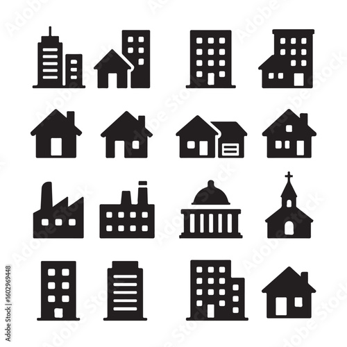 Vector Icons of Various Building Types for Real Estate or Urban Planning.