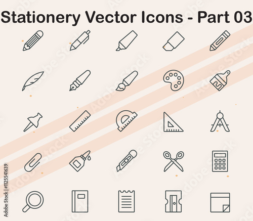 Vector icons representing various stationery items including rulers staplers and scissors ideal for office and educational projects.