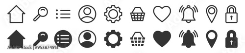 vector, icon, home, search, setting, profile, nubes, bell, map, lock, basket, favourite, interface, design, web, app, outline, filled, flat, graphic, symbol, black, white, illustration, modern