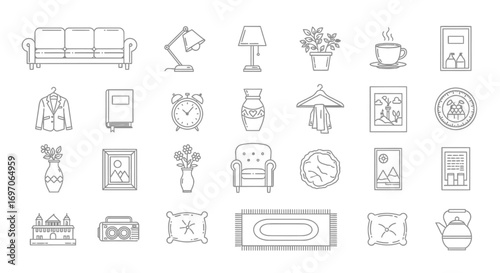 furniture, icon, set, doodle, vignetting, hand-drawn, illustration, vector, home, interior, design, object, decor, decoration, sofa, couch, armchair, lamp, pillow, rug, carpet, plant, vase, clock, frame, picture, window, kettle, radio, cup, jacket, household, item, collection, graphic, element, house, room, living, bedchamber, comfort, cosy, style, line, art, outline, black, white, monochrome