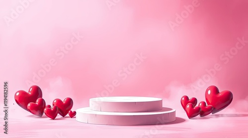 Vector illustration, 3D style. Pink background, heart-shaped details, 3D podium. Smooth gradient transitions, rich textures