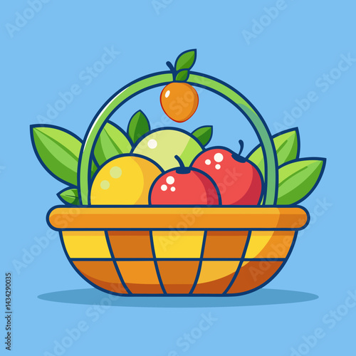 fruit basket, basket, fruit, apple, orange, lemon, leaf, vector, illustration, cartoon, healthy, food, design, graphic, fresh, organic, colourful, cute, icon, clip art, symbol, nature, vitamin, diet, vegetarian, vegan, natural, harvest, farm, market, ingredient, ripe, sweet, delicious, alimentary, wholesome, agriculture, fruit farm, produce, isolated, background, blue