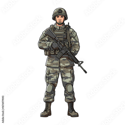vector illustration of a male soldier wearing full camouflage uniform, boots, helmet, and holding a rifle (training/guard duty), standing confidently. Plain white background.