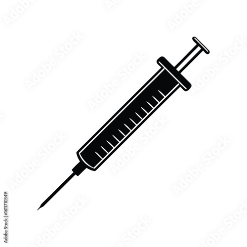 syringe, injection, medicals, medicine, health, health care, treatment, needle, shot, vaccine, vaccination, immunisation, clinic, hospital, pharmacy, drug, illustration, vector, isolated, black, white, silhouette, contour, flat, design, graphic, icon, symbol, medical equipment, medical supplies, tool, equipment, object, metal, steel, instrument, screwdriver, screw, work, white background