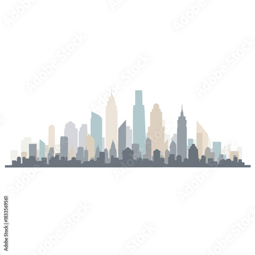 Vector illustration of a modern city skyline silhouette with a panoramic view of tall skyscrapers and architectural buildings in muted pastel colors