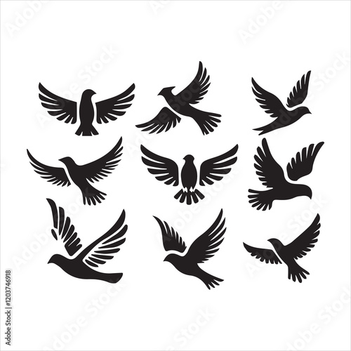 bird, silhouette, vector, eagle, wing, animal, flying, wing, dove, illustration, black, fly, feather, hawk, symbol, tattoo, design, pigeon, icon, set, nature, signs, bird, flight, angel