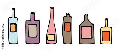 Vector illustration of a set of colored bottles of different shapes with labels. Hand drawn icon and symbol for web, menu, print, poster, sticker, card design. Doodle design elements.