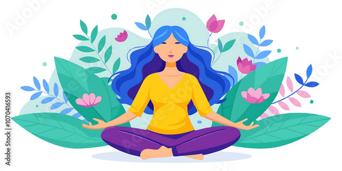Vector illustration of a woman with long blue hair sits crosslegged in a meditative pose surrounded by green leaves and pink flowers.
