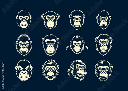 monkey, logotype, vector, ape, icon, face, head, hair, power, art, nature, cool, design, isolated, vintage, illustration, cartoon, white, poster, animal, retro, happy, black, character, portrait, cute, graphic, silhouette, vignetting, hipster, tattoo, africa, jungle, drawing, funny, fun, mammal, wildlife, zoo, primate, element, mascot, gorilla, chimpanzee, chimpanzee, symbol, angry, smiling, style