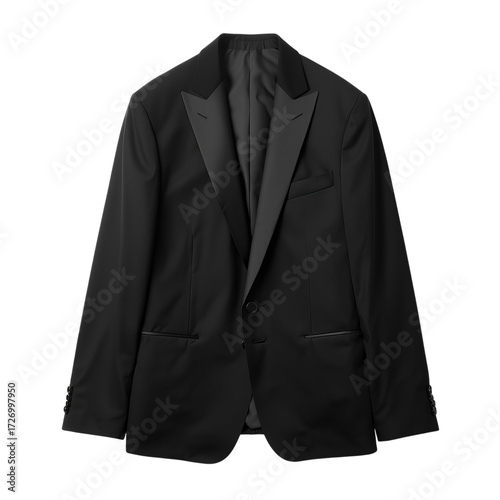 tuxedo, jacket, black, suit, menswear, clothing, apparel, fashion, style, garment, outerwear, coat, blazer, satin, lapel, collar, buttons, cuff, sleeve, fabric, textile, tailoring, tailored, smart, elegant, sophisticated, classic, modern, designer, luxury, business, occasion, event, wedding