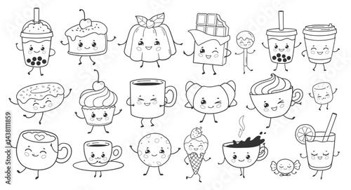 drink, food, cup, dessert, adorable, beverage, black-and-white, candy, cartoon, character, chocolate, hot drink, cold drink, collection, cookie, croissant, cupcake, cute, donut, doodle, drink, emotion, face, funny, happy, hot drink, ice cream, illustration, isolated, joyful, juice, line art, marshmallow, minimalistic, object, outline, playful, vignetting, smiling, sweet, vector, whipped cream