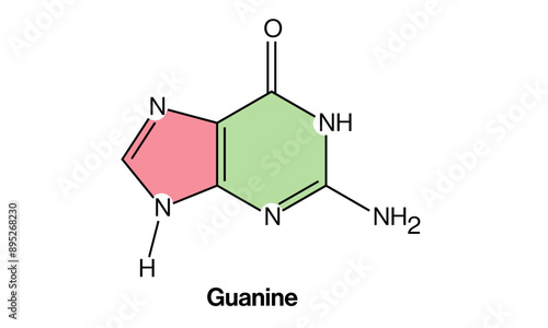 Vector Illustration of Guanine Chemical Structure, DNA Base Diagram on White Background, Molecular Model, Scientific Graphics, Chemistry Illustration.
