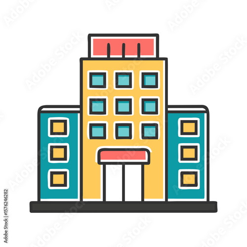 Vector illustration of modern city architecture with various shops and businesses, perfect for an urban design icon