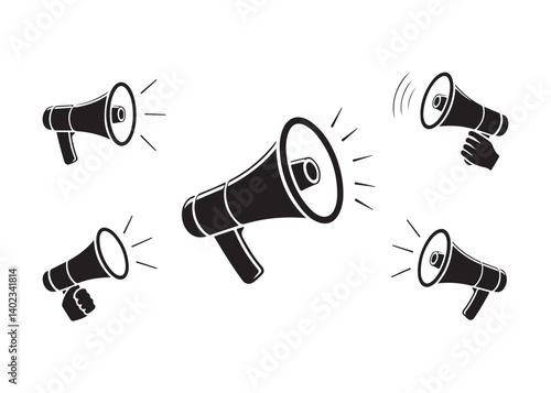 megaphone, announcement, communication, sound, speaker, protest, activism, demonstration, speech, graphic, icon, vector, silhouette, black-and-white, illustration, loud, signal, herald, message, poster, hand, holding, hand-held, news, information, media, campaign, event, advertisement, black, white, simple, modern, trendy, flat, editable, speech bubble, loudspeaker