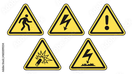 hazard, symbol, safety, warning, danger, signs, industrial, warning, triangle, electrical, explosive, material, general, caution, tripping, protective, measure, workplace, risk, assessment, regulation, accident, prevention, identification, potential, danger, awareness, signage, management, protocol, equipment, health, and, alert, first, hazard, construction, site, dangerous, environment, risk, electric, shock, explosion, illustration, yellow, signs, black, symbol