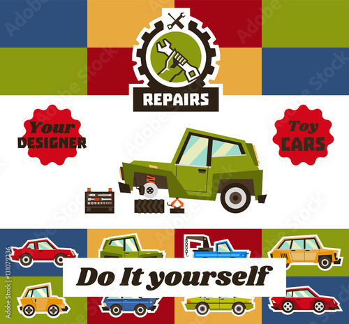 Vector illustration on the theme of vehicle repair and assembly for the child. Designed for packing a toy. The car with the removed wheel. One can see the chassis of transport.