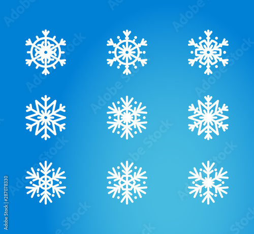 Vector illustration, snowflake icon set. Isolated white silhouette on a blue background with gradient. Applicable as a decorative element for Xmas designs, winter weather concepts etc.