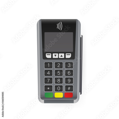Vector illustration with terminal on white background. Mockup for concept design. Isolated vector illustration. Online store payment.