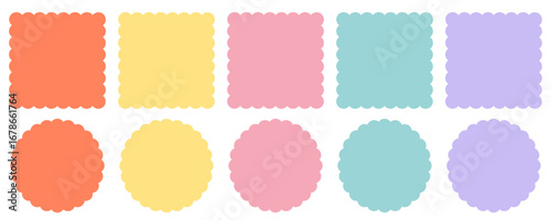 Vector image of geometric shapes with wavy edges in a zigzag shape with jagged edges. Set of stickers in the form of an oval and a circle, rectangle, square. Abstract elements for your design, frames,