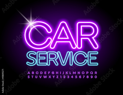 Vector industrial sign Car Service. Glowing bright Font. Neon Alphabet Letters and Numbers set