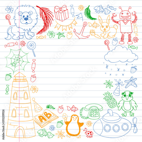 dino, dinosaur, elephant, cloud, submarine, penguin, anchor, starfish, rabbit, lion, snowman, phone, present, pattern, lighthouse, vector, web, spider, game, lesson, learning, toy, owl, kindergarten, doodle, crayons, wax crayons, drawing, pineapple, fruit, creativity, imagination, boy, girl, school, animal, small, family, cover, book, banner, leaflet, birthday, children