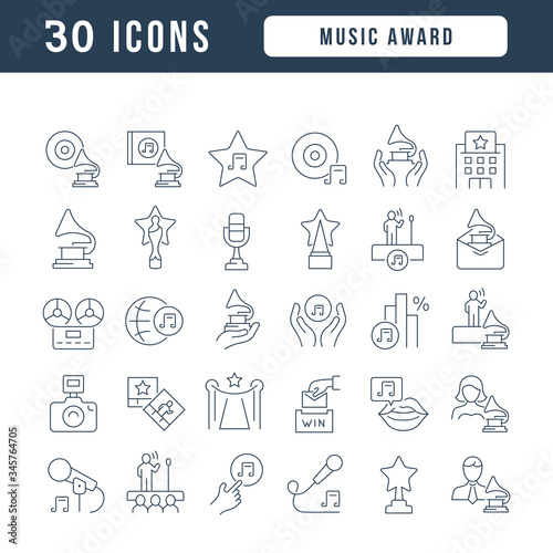 music, award, icon, symbol, design, set, vector, flat, signs, process, web, line, collection, element, linear, digital, logotype, modern, infographic, pictogram, concept, graphic, sound, singer, artist, audio, famous, record, studio, media, trophy, performance, rock, microphone, popular, ceremony, presentation, winner, best, prize, star, show, radio, event, hollywood, celebrity, entertainment, gramophone, america, song