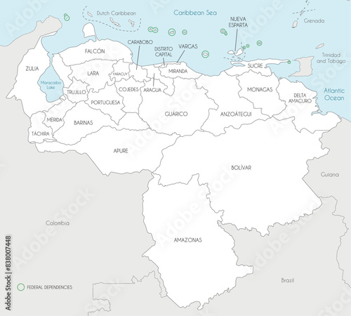 Vector map of Venezuela with states, capital district, federal dependencies and administrative divisions, and neighbouring countries. Editable and clearly labeled layers.