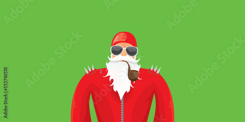 vector modern rock n roll santa claus with smoking pipe, santa beard and funky hat isolated on green christmas horizontal banner background with snowflakes. Horizontal Christmas hipster party poster