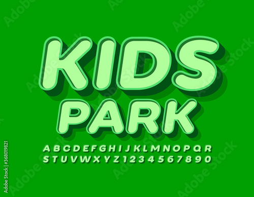 Vector Natural emblem Kids Park with Green 3D Font. Trendy retro style Alphabet Letters and Numbers