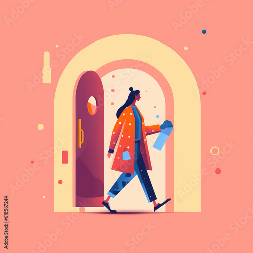 Vector of a person walking through a door on her way outside to work for her business Generative AI.
