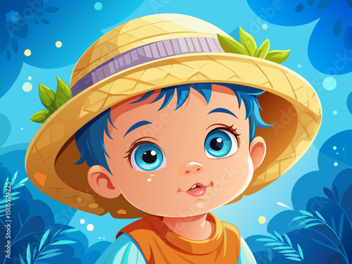 vector of Adorable baby girl wearing a natural straw hat with a soft expression and stunning blue eyes in a soft light environment.