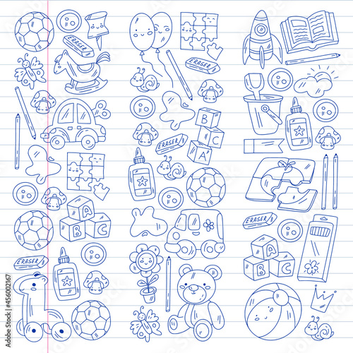Vector pattern with boys and girls. Kindergarten and toys. Happy childhood and creativity with imagitanion.