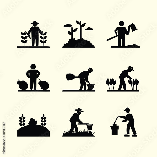 Vector pictograms of agricultural activities, including planting, growing, and farm work
