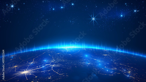 Vector. Planet Earth from space. Flickering lights of cities. Map of the mainland. Global communications system and the World Wide Web. Technologies and communications. Globalization. Luminous sphere.