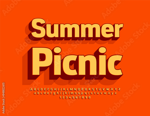 Vector recreational banner Summer Picnic. Trendy 3D Font. Creative set of bright Alphabet Letters, Numbers and Symbols