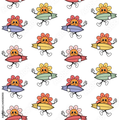 Vector seamless pattern of different color retro groovy cartoon flower with surf board isolated on white background