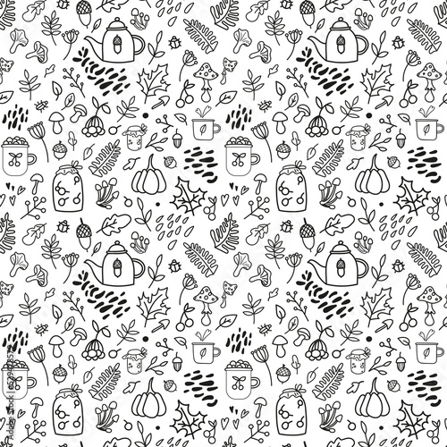 Vector seamless pattern with autumn plants, leaves, herbs, mushrooms and kettle of tea. Decorative illustration in doodle style . For design wallpaper, textile, fabric, wrapping paper, cover, card.