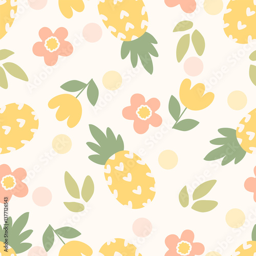 Vector seamless pattern with fruits, flower, leaf, pineapple and polka dot background vector