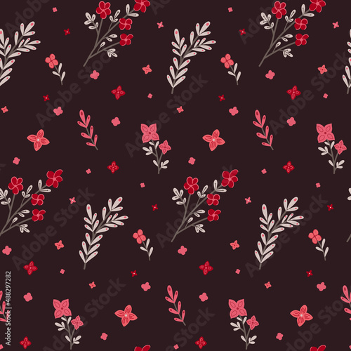 Vector seamless pattern with small pink flowers and stems with foliage on dark background. Natural texture with sakura branches. Floral wallpaper. Delicate hand drawn cartoon ditsy fabric