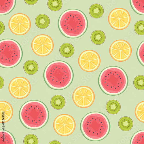 fruit, seamless, pattern, watermelon, orange, kiwi, citrous, food, summer, art, vector, illustration, design, red, green, fresh, tropics, tropical, lemon, lime, cute, background, ripe, energy, health, slice, sliced, freshness, juicy, mixed, tasty, cut, diet, sweet, eating, vitamin, colourful, colours, nature, delicious, wallpaper, decoration, tile, style