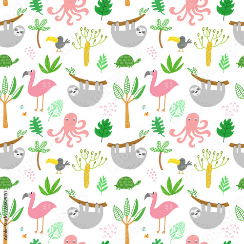 Vector seamless tropical pattern with cute tropical animals: flamingo, sloth, bird