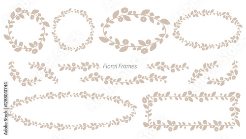 Vector set of calligraphy beige floral frames for special occasions. Soft and natural logo template. Flowers and leaves for wedding invitations save the date cards.