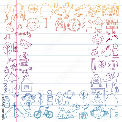 adventure, animal, art, axe, background, backpack, banner, bear, binocular, boot, boy, camera, camp, campfire, cartoon, children, collection, design, doodle, drawing, element, fishing, flashlight, food, forest, girl, hiking, holiday, icon, illustration, children, kindergarten, lantern, mountain, nature, object, pattern, recreation, school, scout, set, small, sport, summer, travel, tree, vacation, vector, camping