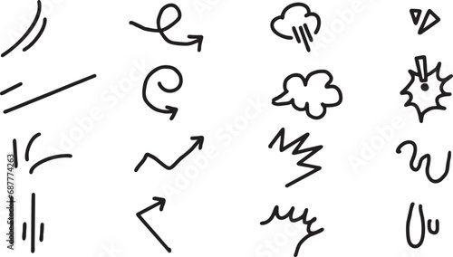 Vector set of doodle hand drawn cartoon expression signs, curve direction arrow, emoticon effect design elements, cartoon character emotion symbol, cute decorative brush stroke line.