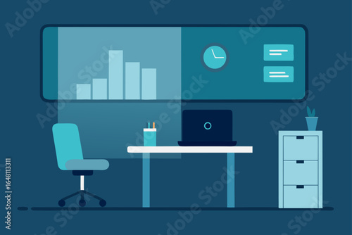 Vector set of flat office technology icons, modern office and bathroom interior illustration