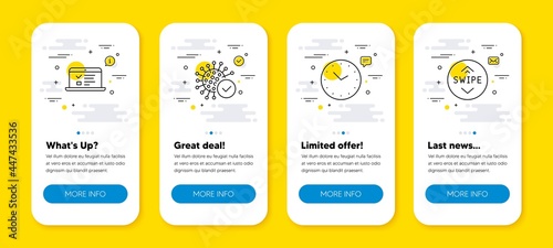 Vector set of Web lectures, Coronavirus and Time line icons set. UI phone app screens with line icons. Swipe up icon. Online test, Confirmed infection, Clock. Scroll screen. Phone UI banners. Vector