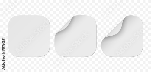 Vector set of white paper squircle stickers isolated on transparent background. Realistic square stickers curved with white corner and soft shadows.