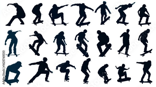 Vector silhouette collection of skateboarders in various active poses