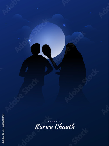 Vector silhouette illustration of married couple in full moon night celebrating Karwa Chauth, Poster design.