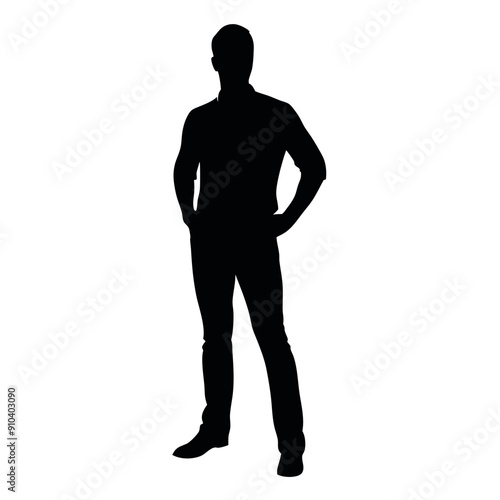 vector silhouette of a man dressed in a shirt and jeans standing with hands on hips, side view